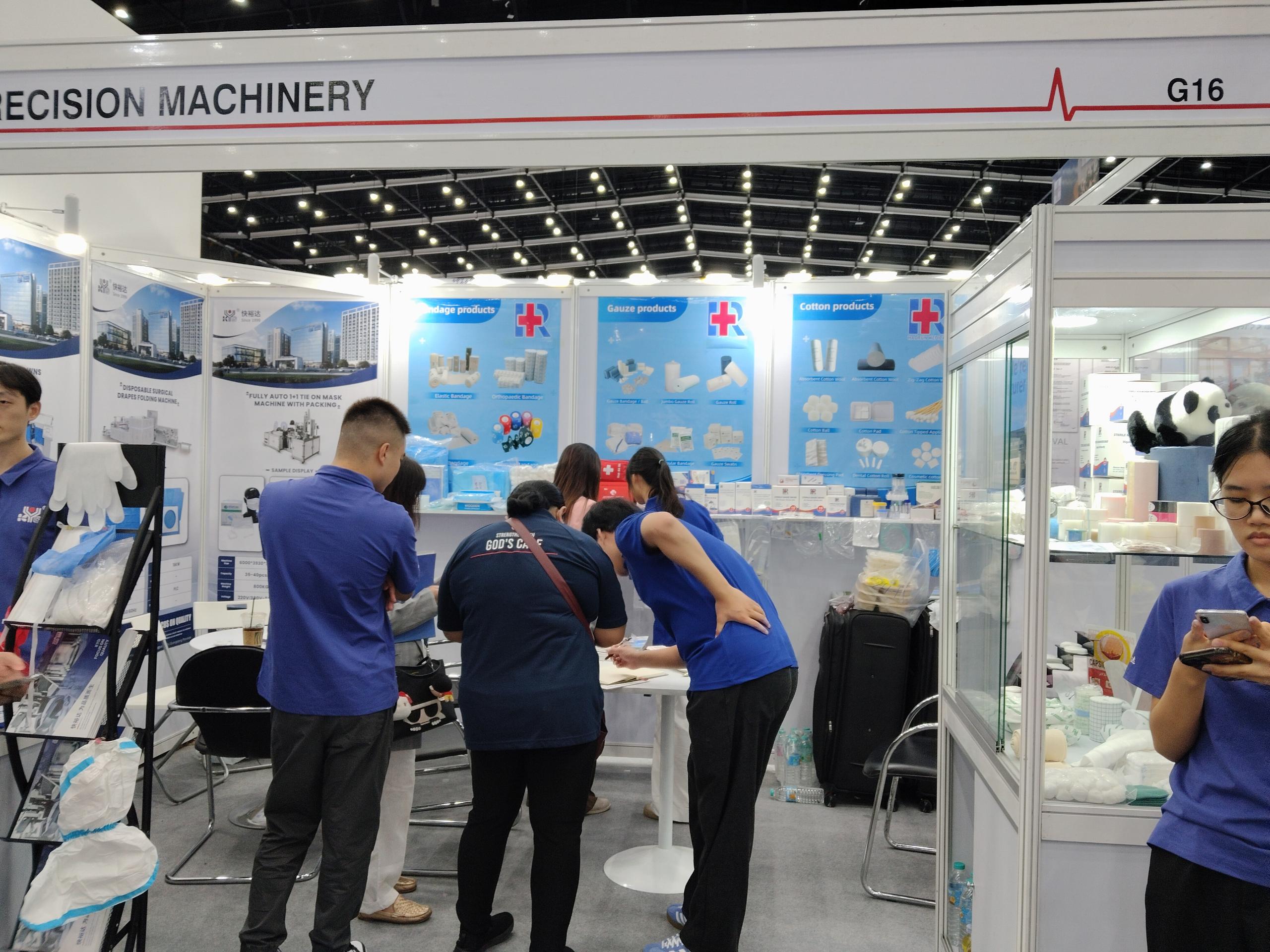På utstillingsstedet er G16-standen til HAORUN MEDICAL svært iøynefallende. Som det kan ses av bildene på stedet, er det utstillingsplakater av ulike medisinske produkter rundt omkring, som dekker ulike medisinske forsyninger som bandasjer og bomullspinner. Personalet, kledd i uniformsblå klær, er opptatt med å kommunisere med det profesjonelle publikummet som kommer for å konsultere. Noen introduserer nøye egenskapene og fordelene til produktene til publikum, mens andre registrerer nøye kundenes behov og tilbakemeldinger. Atmosfæren på stedet er varm og profesjonell.
